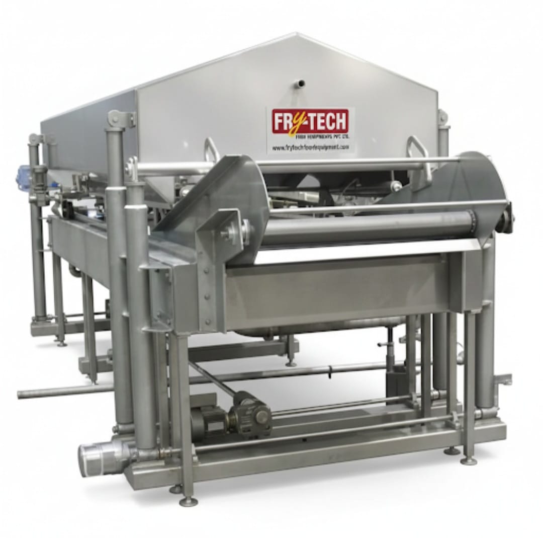 A belt fryer with a "submerged" mesh to keep slices under oil.