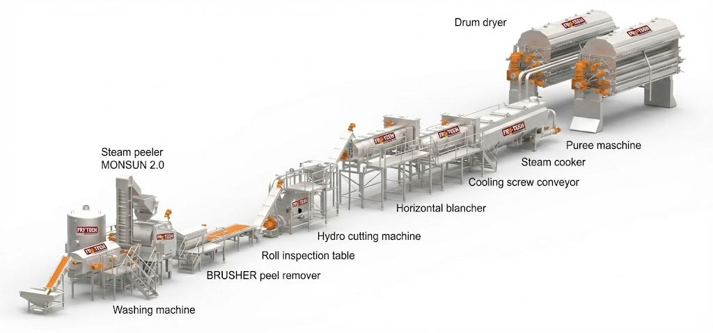 that converts raw potatoes into dehydrated, shelf-stable flakes.1 Unlike